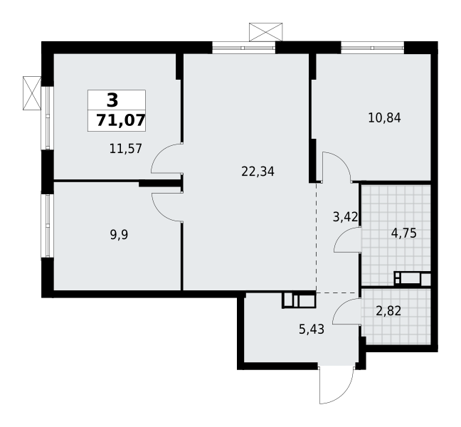 | 71.07 м2 | — | 22.34 м2 | 3 | ![]() |